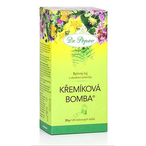 Bylinný čaj Dr. Popova Kremíková bomba®  obsahuje vyváženú zmes bylín, ktoré  prispievajú k zdravému stavu pokožky, vlasov a nechtov . Praslička pomáha vďaka  mineralizácii k  tomu, aby naša  pleť, ale aj vlasy a nechty zostali v dobrom stave . Žihľava priaznivo pôsobí na  zdravý stav kože a podieľa sa na jej hojenie. Obsahuje rad minerálnych látok, železo  a dodáva telu potrebnú energiu aj vitalitu. Truskavec pôsobí vďaka obsahu stilbenes a resveratrolu antioxidačne .