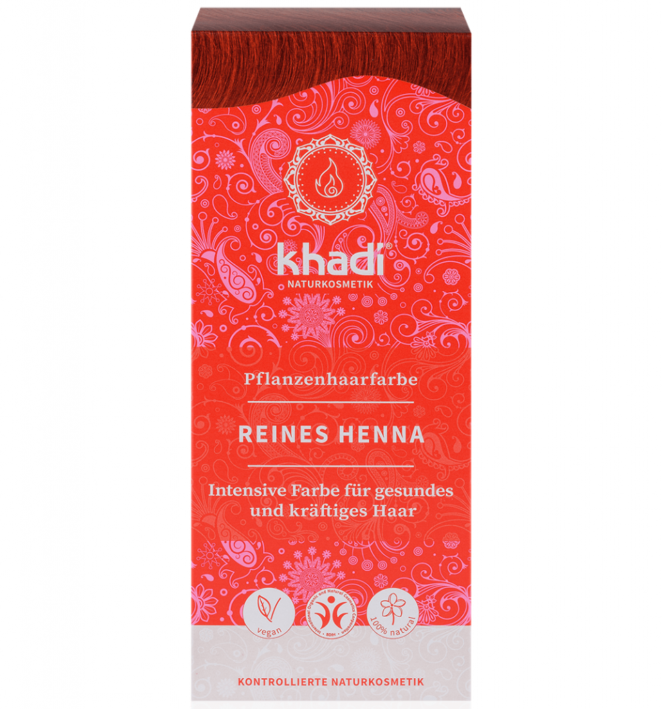 Čistý prášok henna značky Khadi zafarbuje vlasy, vychadzajúc od ich prirodzenej farby, na oranžovo (blond vlasy), alebo na krásne mahagónové odtiene (svetlo hnedé až hnedé vlasy). Henna je prirodzené farbivo na vlasy, ktoré môže byť zmiešané s inými rastlinnými práškami značky Khadi – takto získate farbu podľa vlastných predstáv.