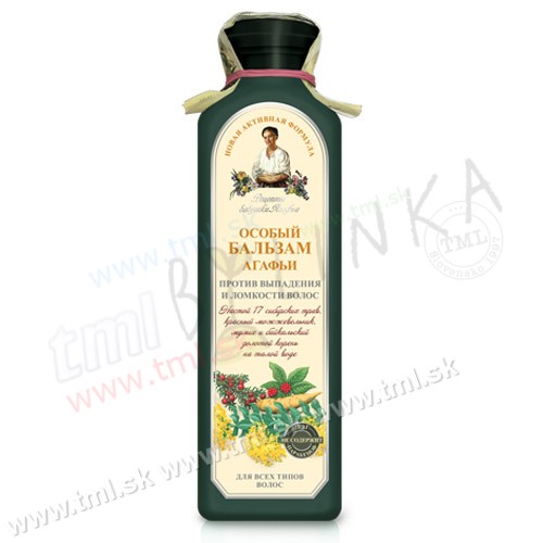 Balzam babičky Agáty pre všetky typy vlasov posilňuje vlasové korienky, dodáva vlasom pružnosť a zaisťuje ich zdravý rast. Základom balzámu je rozmrznutá voda a výťažky zo 17 sibírskych byliniek, červenej borievky, mumia, ženšenu a bajkalského zlatého koreňa – šišiak. Rozmrznutá voda sa už v minulosti používala na ozdravenie. Rozmrznutá voda pôsobí na vlasy ako kondicionér, a v spojení s prírodnými zložkami – horským balzamom (mumio), bajkalským zlatým koreňom a červenou borievkou – ochráni vlasy pred vypadávaním, dodá im pružnosť a zaistí ich zdravý rast.