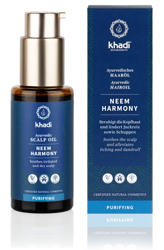 Khadi ajurvédsky olej NEEM HARMÓNIA pre vlasovú pokožku – pre upokojenie, harmonickú pokožku v rovnováhe, bez svrbenia a bez lupín